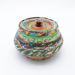 Un portaoggetti con coperchio realizzato da Natalie, giocando con il colore dei volantini a sua disposizione. Un oggetto semplice e resistente che può diventare un contenitore utile per riporre oggetti più svariati o come svuota tasca che colorerà gli ambienti della tua casa o quella degli amici a cui lo regalerai.